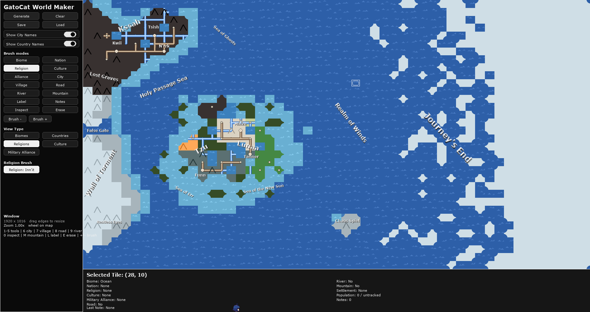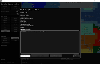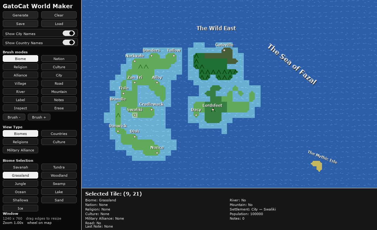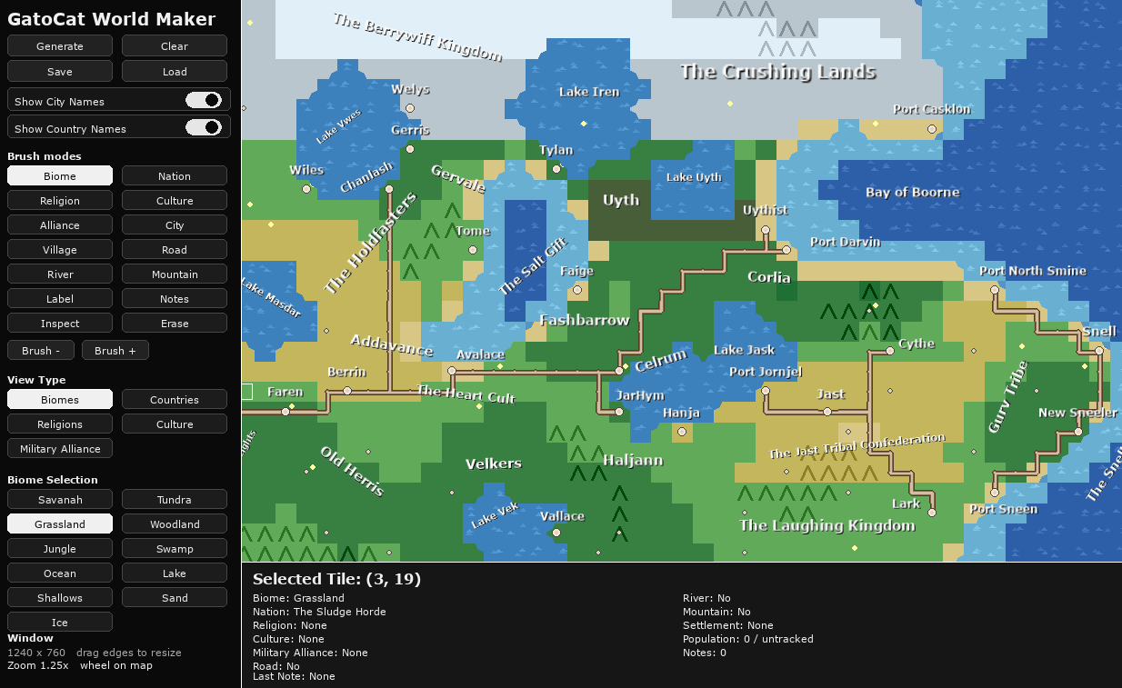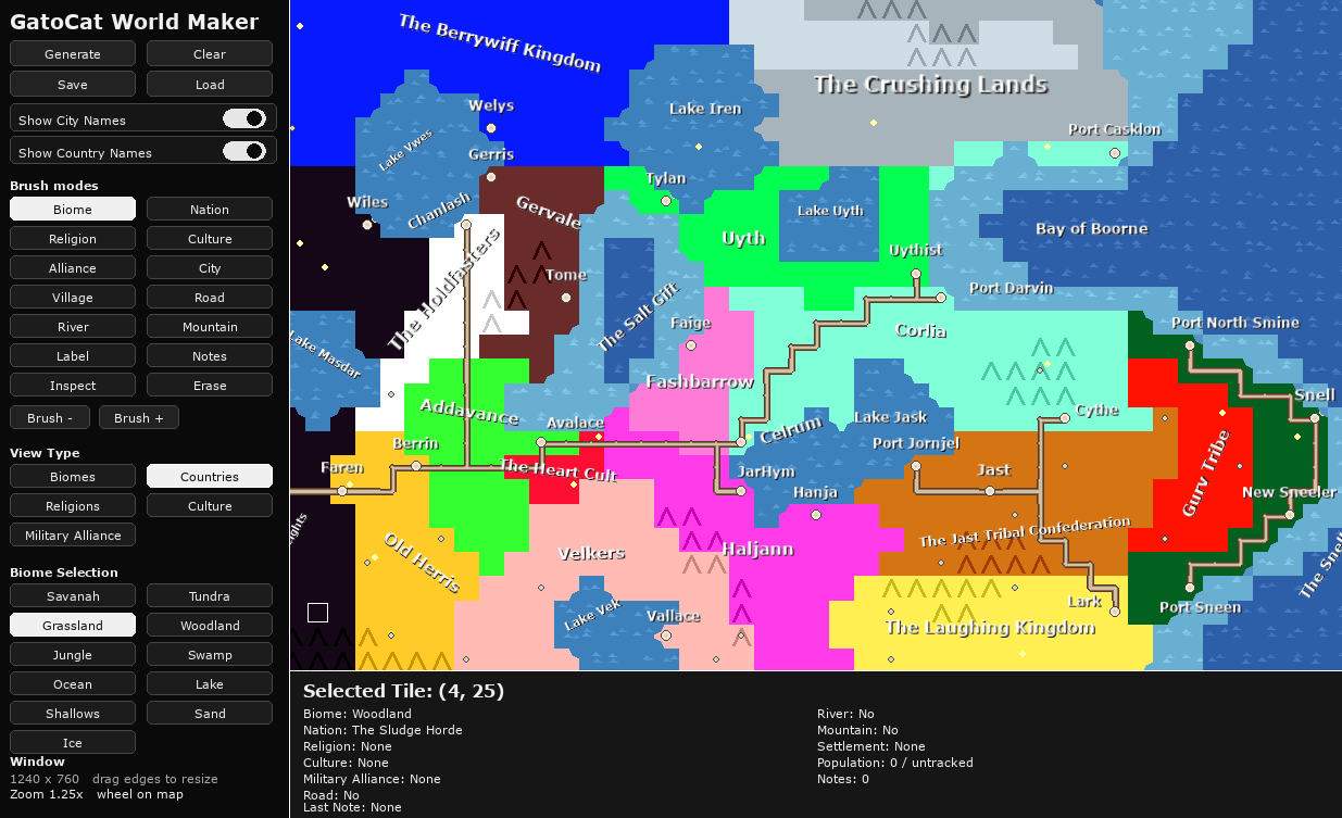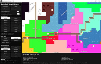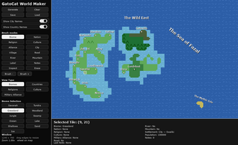 GatoCat World Maker is a lightweight fantasy map creation tool that lets you quickly generate and edit procedural worlds. Paint biomes, countries, religions, cultures, rivers, roads, mountains, and settlements directly onto a grid map, then annotate your world with labels and notes. Designed for worldbuilders, writers, and game designers who want a fast, visual way to develop and organize their settings